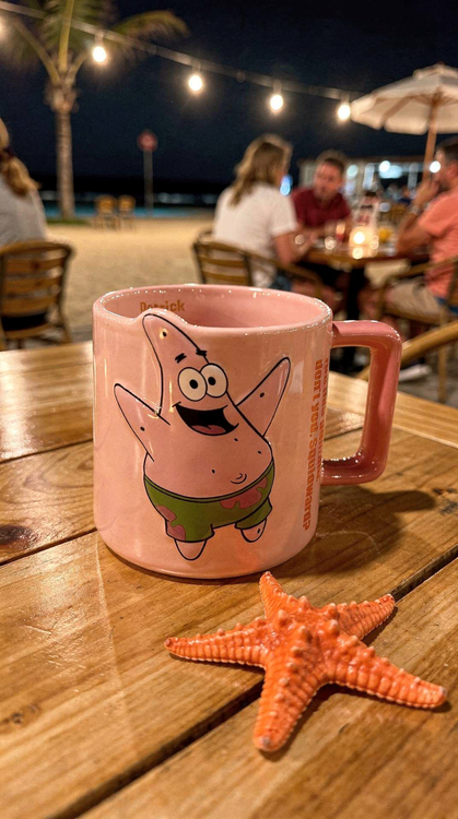 طراحی کارتونی پاتریک با اون لبخند دوستداشتنی و ژست شادش، هر جرعه نوشیدنی رو تبدیل به یه لحظهی خوشحالکننده میکنه ☕💗